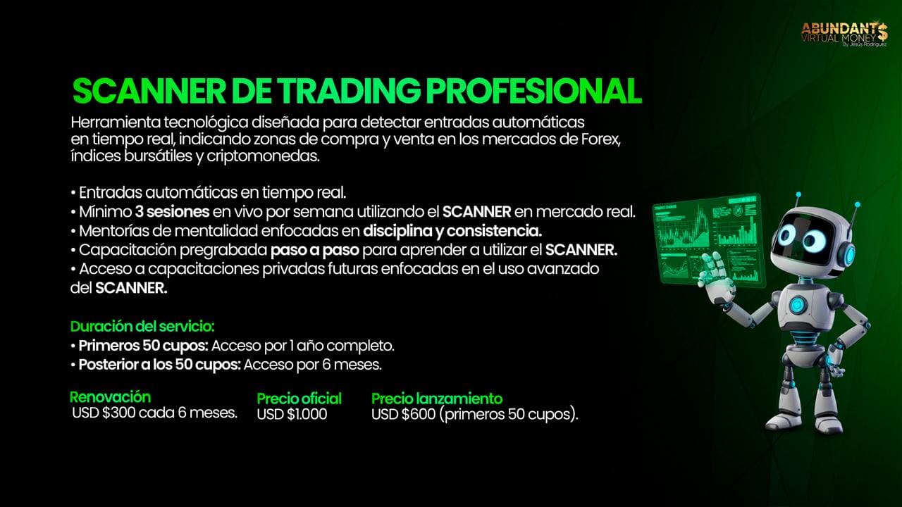 Utiliza tecnología aplicada al trading como el SCANNER, que te ayuda a identificar zonas de compra y venta en tiempo real, junto con sesiones en vivo donde lo usamos en mercado real.
